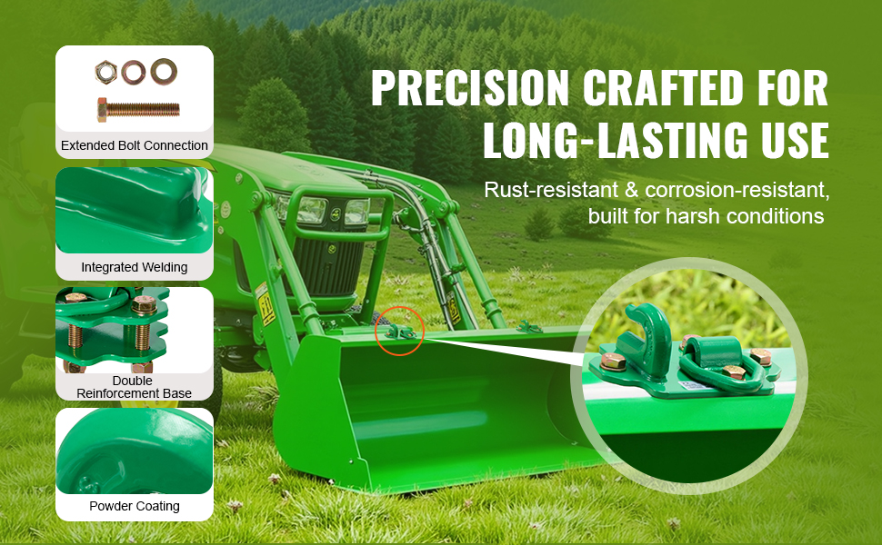 Traktoriin asennettavissa koukuissa on kaksinkertainen kiinnitysjärjestelmä: pultit ja mahdollinen hitsaus varmistavat vakauden ja luotettavuuden vetotilanteissa. Vihreä pulverimaalipinta suojaa ruosteelta ja korroosiolta ja parantaa kestävyyttä vaativissa sääolosuhteissa.