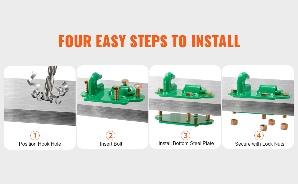 3/8" pultattavat kauhan koukut sidontarenkaalla traktoreihin, RV-, UTV- ja kuorma-autokäyttöön. Koukut on valmistettu G70-taontateräksestä, ja mukana tulevat taustalevyt helpottavat asennusta traktorin kauhaan tai muuhun sopivaan pintaan.