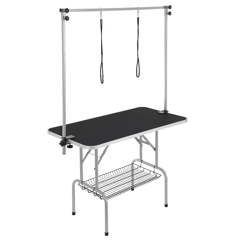 Pöytä on nopea ja yksinkertainen koota ilman ammattilaisen apua tai työkaluja. Taittuva runko helpottaa siirtelyä ja säilytystä, ja alahylly tarjoaa kätevän paikan trimmausvälineille ja muille tarvikkeille.