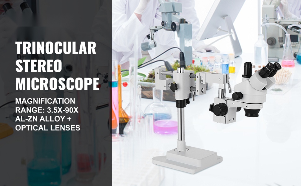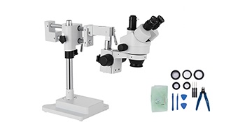 Trinokulaarinen 3.5X-90X stereomikroskooppi, jossa on 360° kääntyvä pää ja säädettävä pilarijalusta. Mikroskoopissa on laaja zoom-alue, kun mukana tulevia 0.5X- ja 2.0X-linssejä käytetään yhdessä. Työetäisyys, silmäteräväli ja diopterisäätö ovat portaattomasti säädettävissä, joten laite sopii monenlaisiin tarkastustehtäviin, kuten PCB-juotosten tarkastukseen ja korjaukseen, hyönteisten havainnointiin, korujen tunnistukseen ja tekstiilien tutkimiseen.