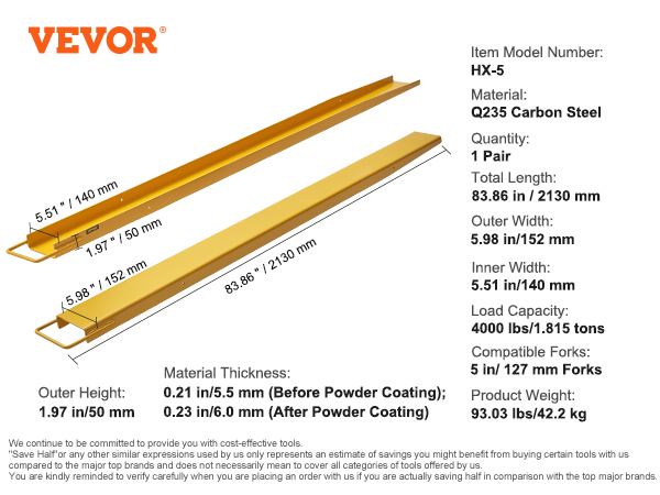 Trukkipiikin jatkeet HX-6 Q235-hiiliterästä 2440 mm 4,5" leveille piikeille 1 pari keltainen