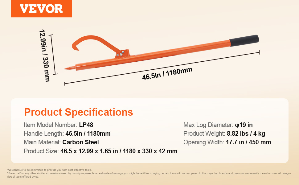 Tämä 46.5-tuumainen tukinkääntäjä hyödyntää vipuvoimaa, mikä helpottaa puiden pyörittämistä, vetämistä ja asettamista sahaukseen. Säädettävä koukku sopii enintään φ18-tuumaisten tukien käsittelyyn, ja kumipäällysteinen kahva parantaa otetta ja käyttömukavuutta. Runkomateriaali on kestävää ja ruostumista hyvin sietävää hiiliterästä, joka soveltuu pitkäaikaiseen käyttöön.