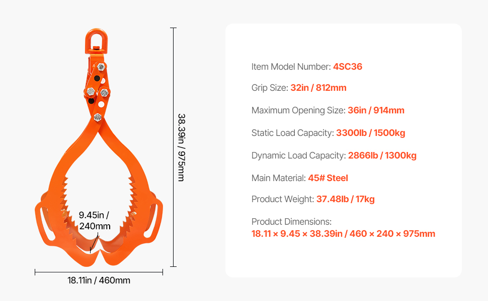Eagle claw -muotoilu varmistaa, että pihtien hampaat pureutuvat puuhun lujasti. Suurin avautumiskoko on 914mm, joten pihdeillä voi käsitellä kookkaita tukkeja ja muita raskaampia kappaleita. Rakenne tukee jopa 1500kg staattista kuormaa turvallista nostamista ja siirtämistä varten.