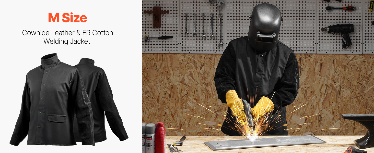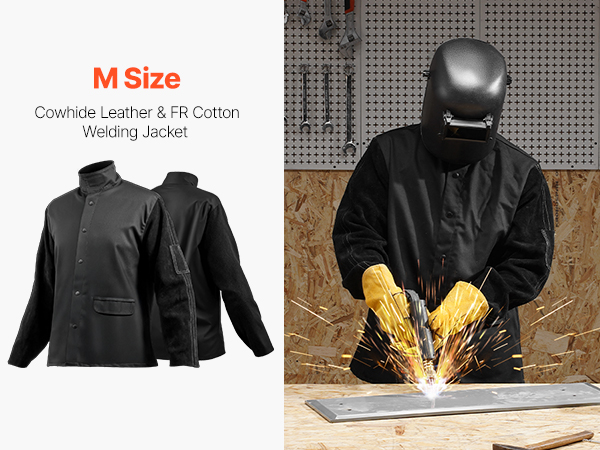 Tulenkestävä hitsaustakki M-koko, raskas jaetusta naudannahasta valmistettu hiha, 9 oz FR-puuvillarunko, nepparit ja taskut