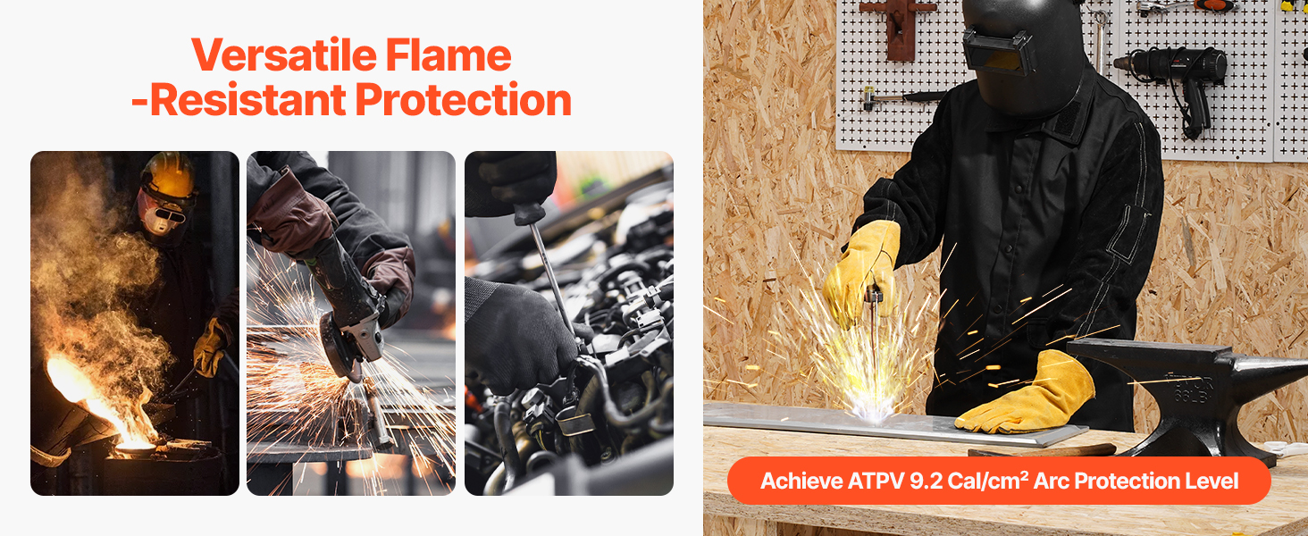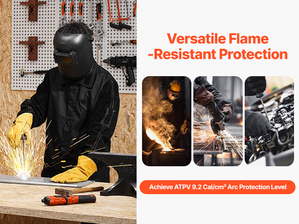Tämä monikäyttöinen tulenkestävä hitsaustakki tarjoaa korkean suojatason, ATPV 9.2 Cal/cm² arc-suojauksen, joka auttaa torjumaan korkeita lämpötiloja ja liekkejä erilaisissa hitsaus- ja metallityötehtävissä.