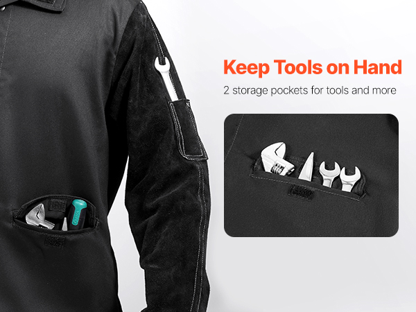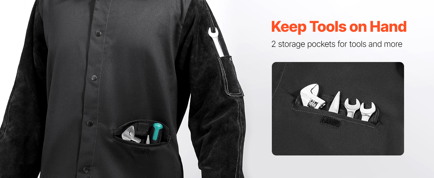 Lämpöä kestävässä takissa on 2 taskua, jotka tarjoavat säilytystilaa tärkeimmille työkaluille ja henkilökohtaisille tavaroille. Näin pidät tarvittavat välineet helposti saatavilla ja paremmin suojassa työskentelyn aikana.