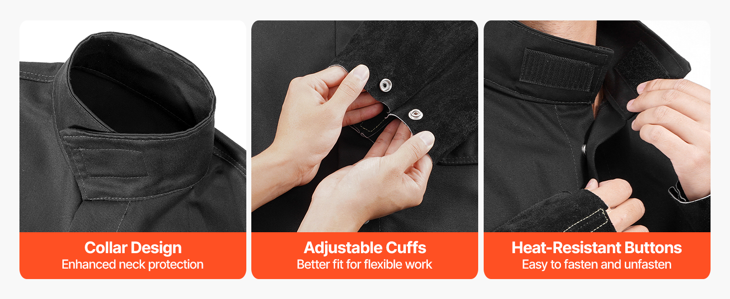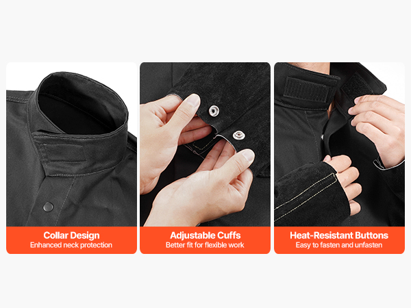 Huolellisesti muotoiltu kaulus parantaa niskanseutuun kohdistuvaa suojaa. Säädettävät hihansuut varmistavat paremman istuvuuden ja antavat liikkumavapautta. Vankat nepparit tekevät hitsaustakin pukemisesta ja riisumisesta nopeaa ja vaivatonta.