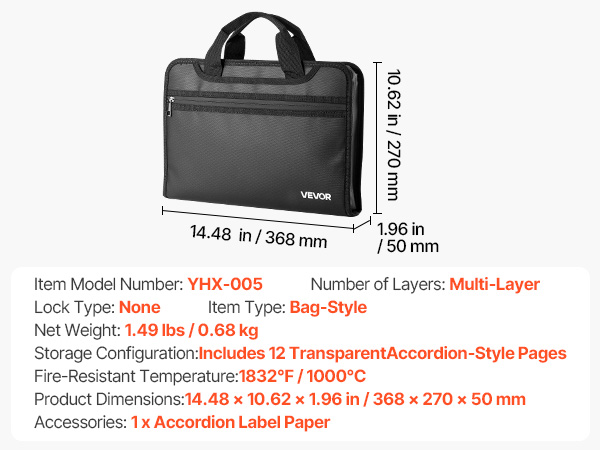 Tulenkestävä ja vedenpitävä asiakirjalaukku suojaa tärkeitä papereita ja elektroniikkaa jopa 1000°C lämpötilassa. Monikerroksinen rakenne ja 12-osainen haitaritasku helpottavat järjestämistä kotona, toimistossa ja matkalla.