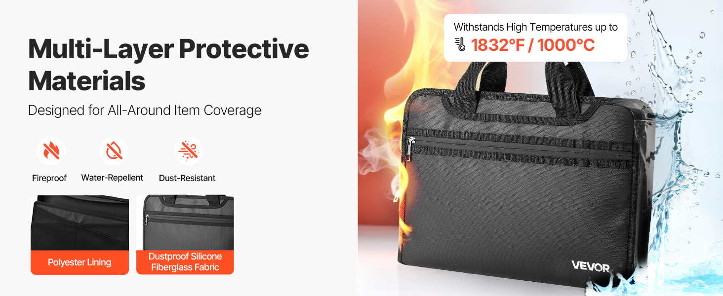 Laukku on valmistettu pölyä hylkivästä silikonipinnoitetusta lasikuitukankaasta, joka kestää jopa 1000°C lämpötilan. Se auttaa pitämään asiakirjat ja laitteet turvassa tulipalon, sateen ja arjen pölyn aikana.