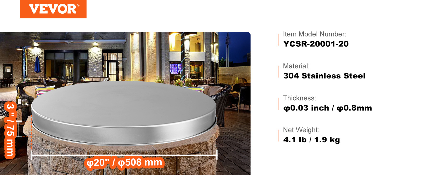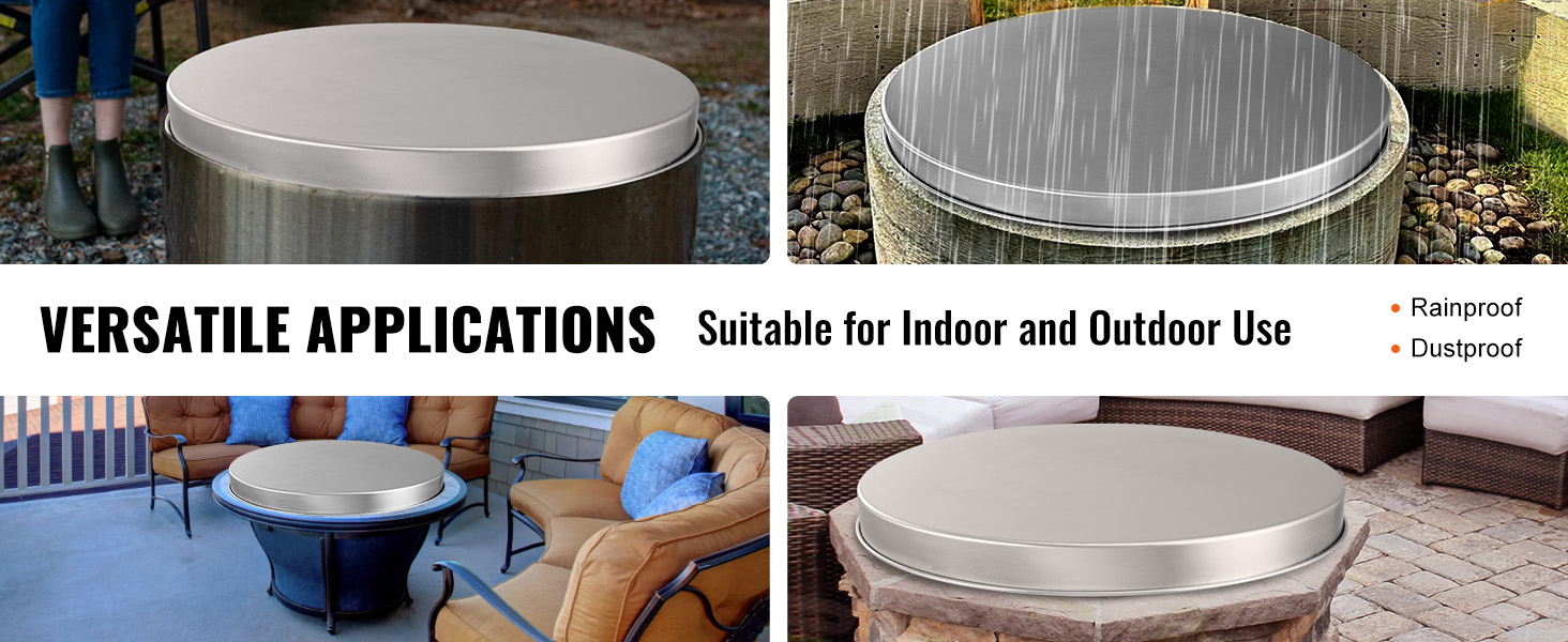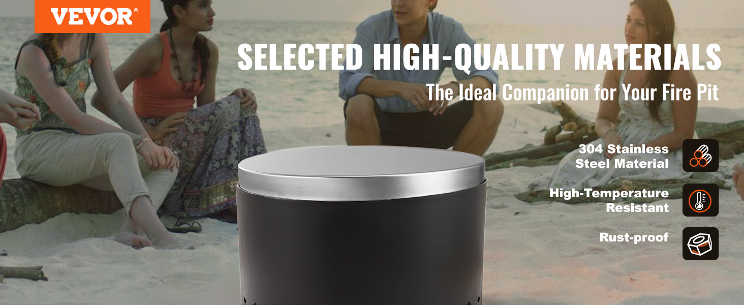 Kansi on valmistettu SUS304‑ruostumattomasta teräksestä, joka on korroosionkestävä ja kestää korkeita lämpötiloja. Tuote soveltuu ulkokäyttöön sääolosuhteet huomioiden.