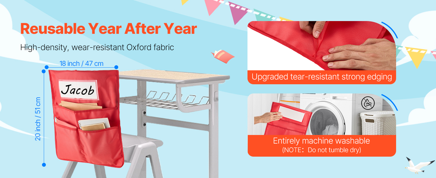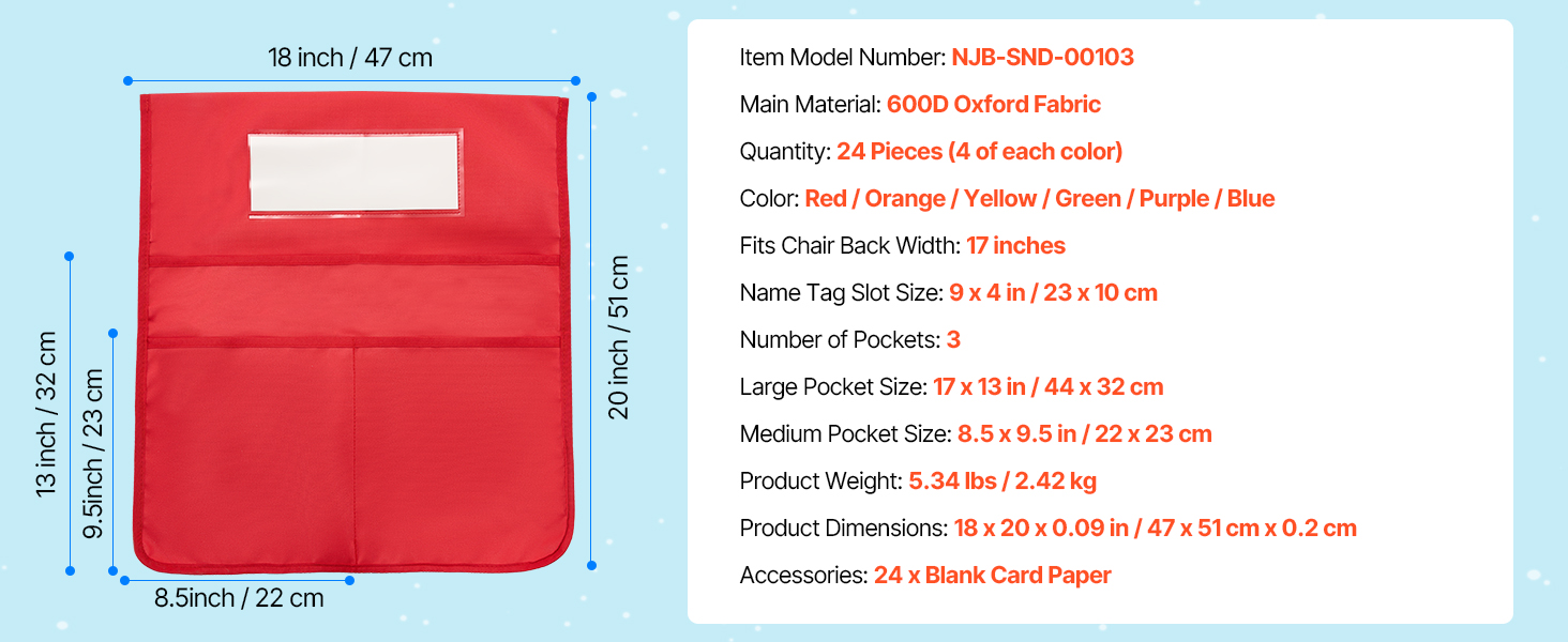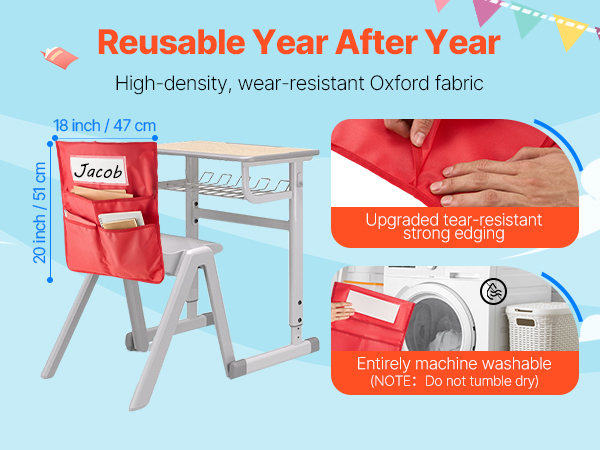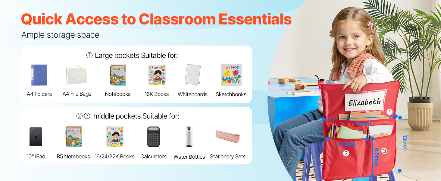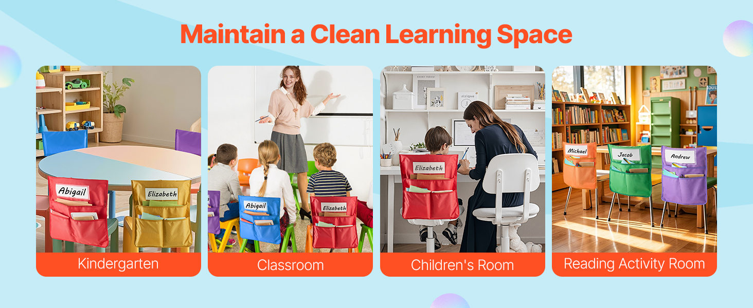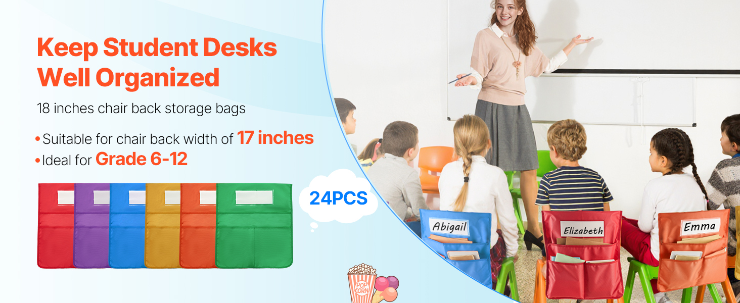 Tämä 24 osasta koostuva tuolin selkänojan taskusarja auttaa pitämään pulpettien ympäristön siistinä ja tarvikkeet omilla paikoillaan. Taskut sopivat noin 17-tuumaisiin tuoleihin ja ovat käytännöllinen ratkaisu luokkahuoneeseen, päiväkotiin, kouluun ja kotiopiskeluun.