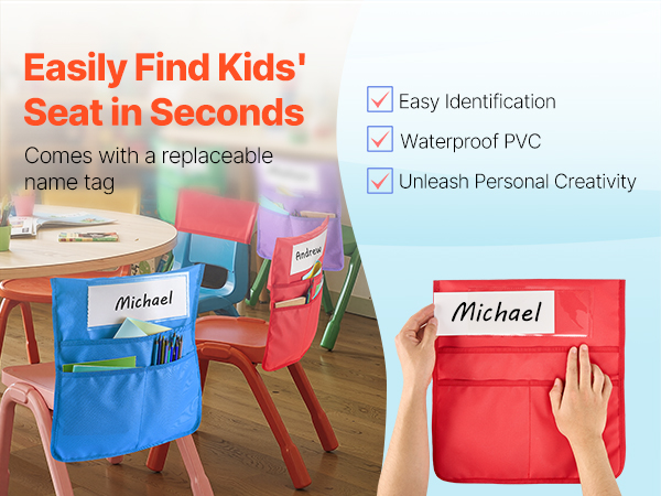 Jokaisessa tuolitaskussa on läpinäkyvä PVC-nimikorttipaikka. Oppilaat voivat luoda omat nimilappunsa, mikä helpottaa paikkojen tunnistamista ja tekee luokkahuoneesta henkilökohtaisemman.