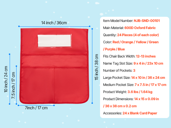 Tuolin selkänojataskut luokkahuoneeseen 24 kpl, 6 väriä, 3 taskua, 600D Oxford-kangas