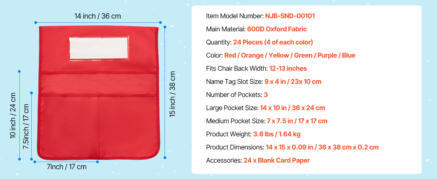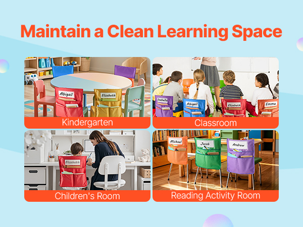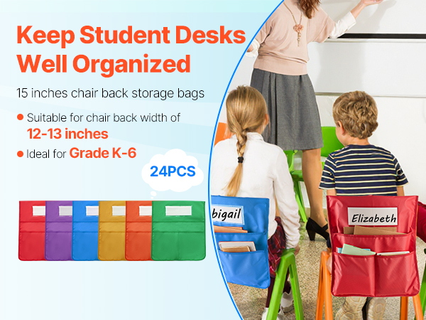 Tuolin selkänojaan kiinnitettävät taskut auttavat pitämään pulpetit siisteinä ja koulutarvikkeet omilla paikoillaan. Pakkaus sisältää 24 taskua (4 jokaista väriä), ja se sopii hyvin luokkahuoneisiin, päiväkoteihin sekä kotiin. Taskut sopivat tuoleihin, joiden selkänojan leveys on 12–13 tuumaa.