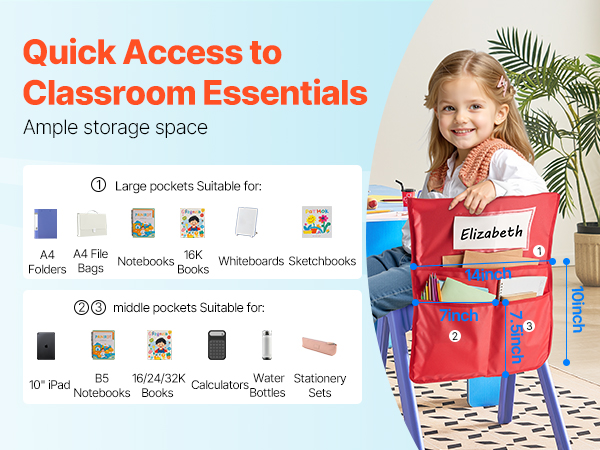 Tuolinselkänojan taskuissa on yhteensä 3 taskua: 1 suuri tasku ja 2 keskikokoista taskua. Niihin mahtuvat kätevästi A4-kansiot, vihkot, kirjat ja muut koulutarvikkeet. Tavarat ovat helposti käden ulottuvilla ja oppilaat oppivat pitämään työpisteensä järjestyksessä.