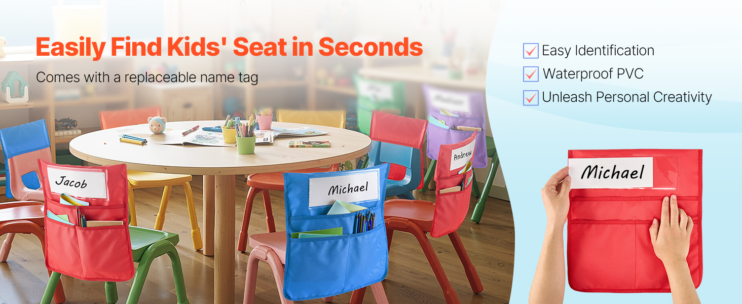Jokaisessa luokkatuolitaskussa on läpinäkyvä PVC-nimilapputasku, johon voi lisätä oppilaan nimen. Lapset voivat suunnitella omat nimilappunsa, mikä tekee käytöstä henkilökohtaisempaa ja helpottaa tavaroiden löytämistä.
