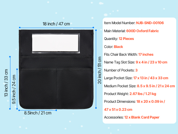 Tuolinselkä-taskut luokkaan, 12 kpl, 3 taskua, musta, 600D Oxford-kangas, nimikorttitasku