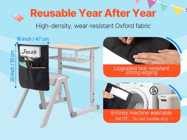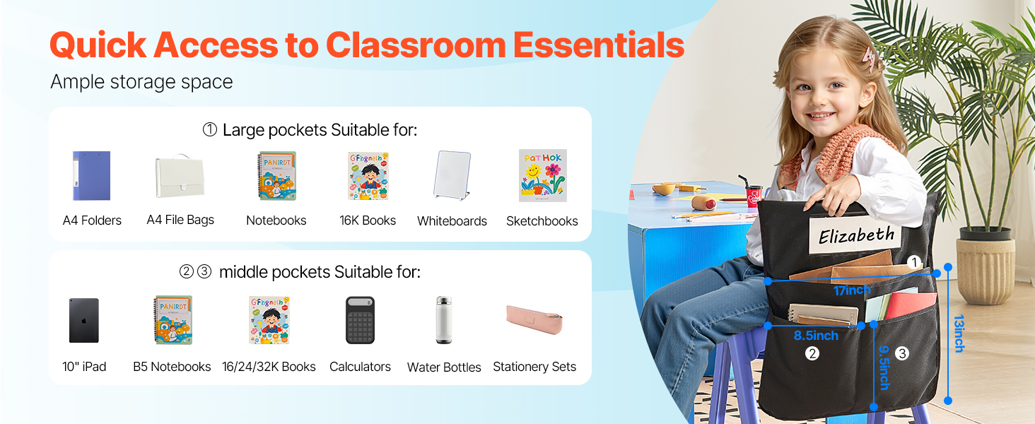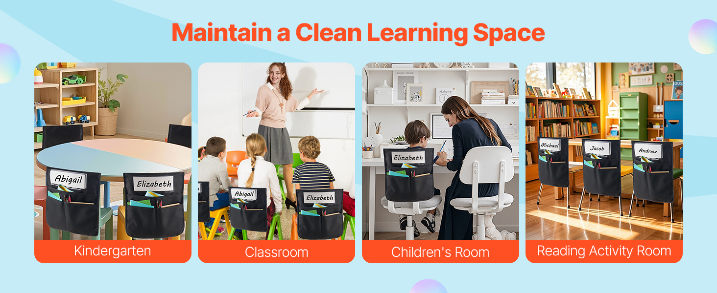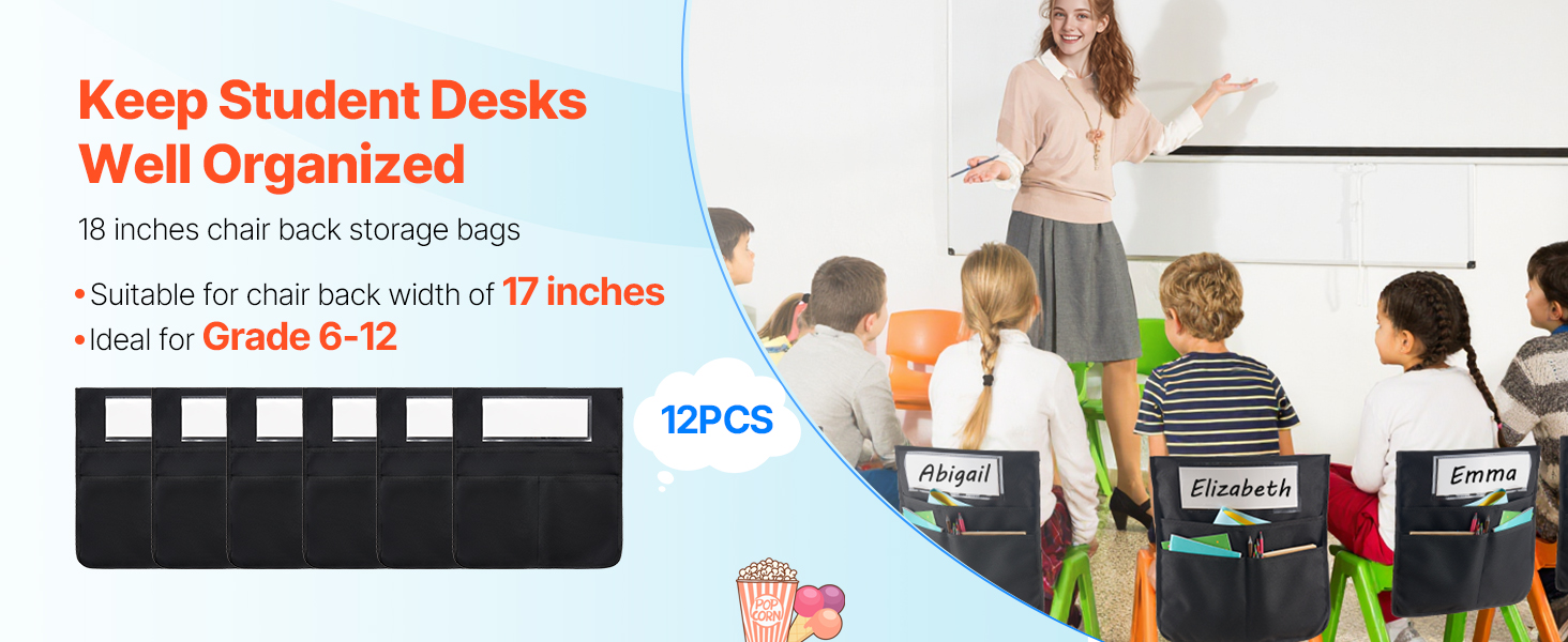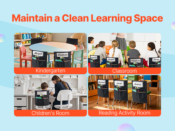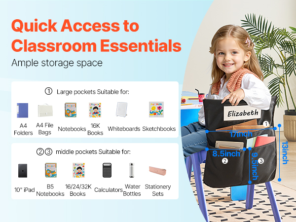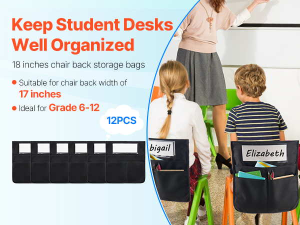 Tämä 12 kappaleen tuolinselkä-taskusetti auttaa pitämään oppilaiden tavarat hyvässä järjestyksessä luokassa, päiväkodissa, koulussa ja kotona. Taskut pujotetaan helposti tuolin selkänojan päälle, jolloin kirjat, vihkot ja tarvikkeet ovat aina käden ulottuvilla ilman, että työpöytä täyttyy.