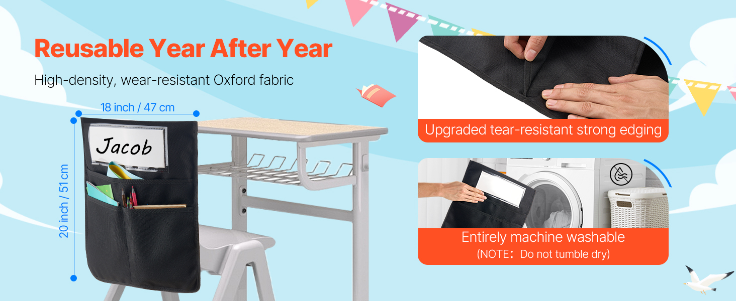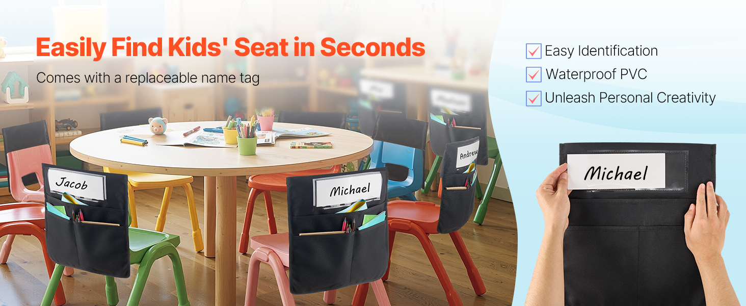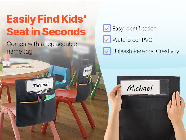 Etupuolella oleva läpinäkyvä PVC-nimikorttitasku tekee omien taskujen tunnistamisesta helppoa. Lapset voivat suunnitella omat nimilappunsa, mikä tuo luokkahuoneeseen pientä lisäiloa ja selkeyttää säilytystä.