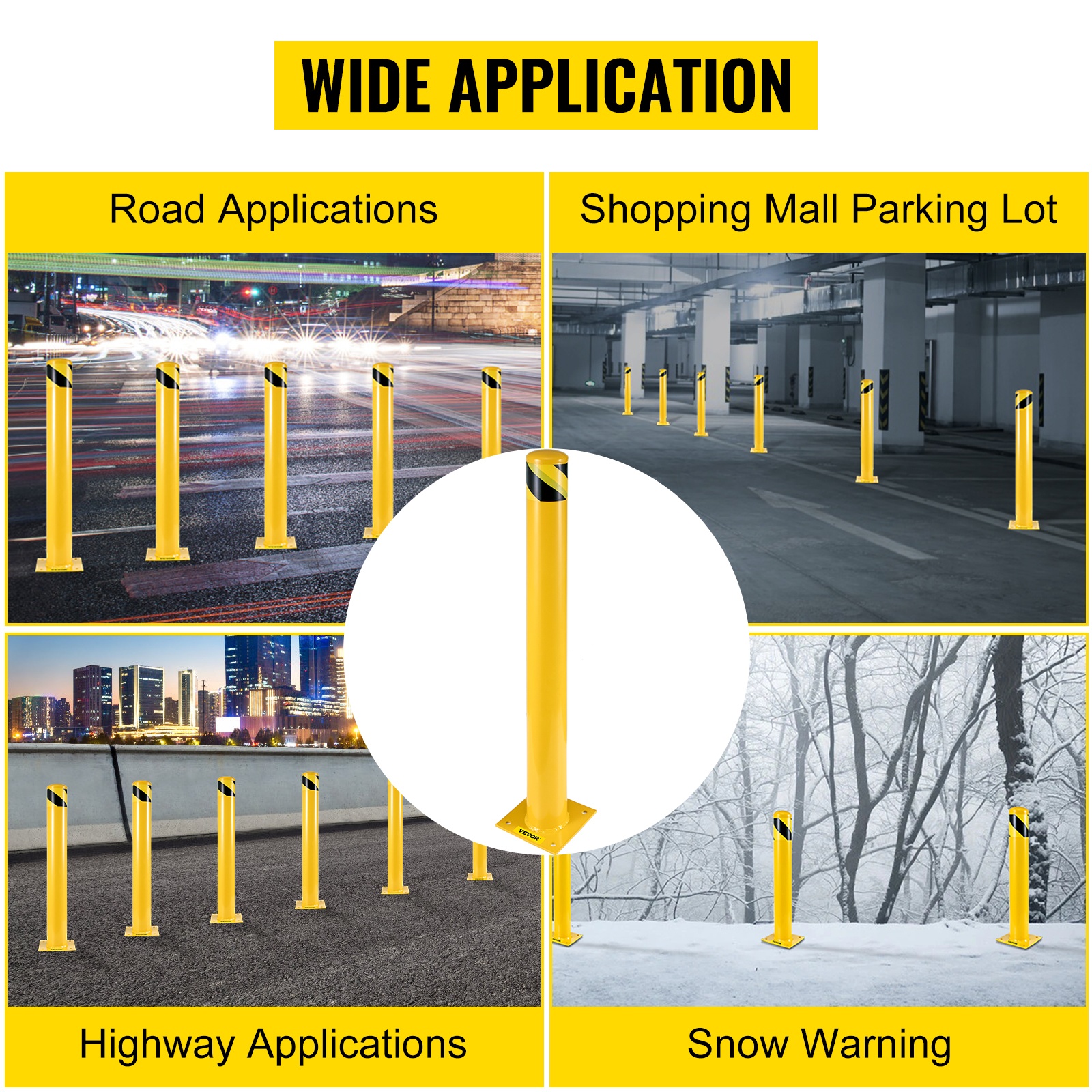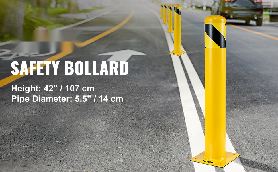 Tämä teräksinen turvapollari auttaa suojaamaan rakennuksia, laitteita ja jalankulkijoita ajoneuvojen aiheuttamilta törmäyksiltä. Kestävä rakenne ja kirkas keltainen väri mustine raitoineen parantavat näkyvyyttä ja ohjaavat liikennettä esimerkiksi sisäänkäynneillä, parkkialueilla ja jalankulkuväylien läheisyydessä.