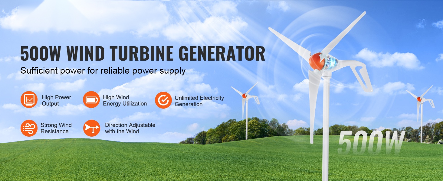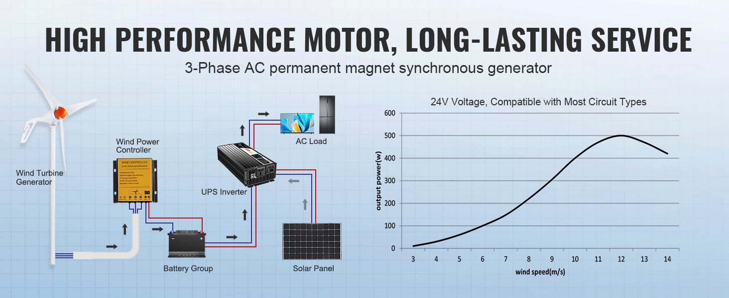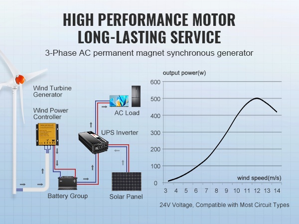 12V tuuligeneraattoripaketti tuottaa jopa 500W nimellistehon. Tuuliturbiini hyödyntää tuuliolosuhteita tehokkaasti ja sopii erityisesti paikkoihin, joissa tuuliresursseja on runsaasti. Säädettävä tuulensuunnan seuranta auttaa optimoimaan energian tuotannon eri olosuhteissa.