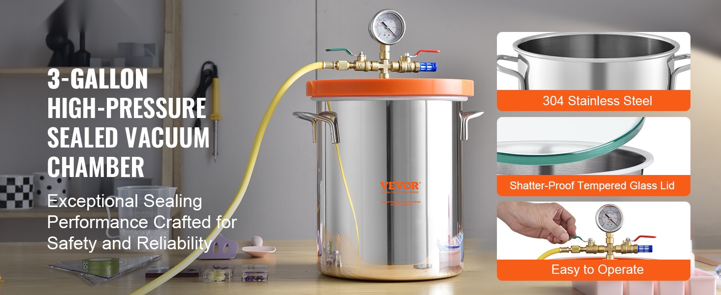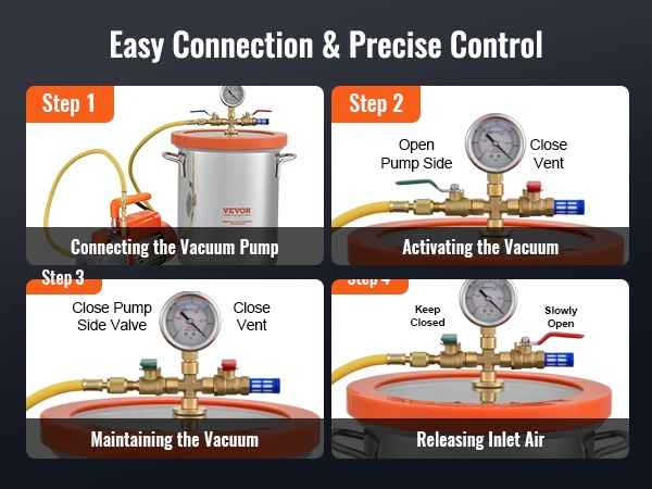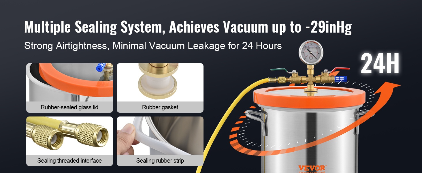 Kannen lisätty silikoninen tiivisterengas sekä venttiilien kierteitetyt liitännät auttavat säilyttämään tyhjiön pitkään. Tämä on tärkeää, kun halutaan lopputuloksia, joissa ei ole epäpuhtauksia tai ilmakuplia esimerkiksi hartsissa, silikonissa tai kipsissä.