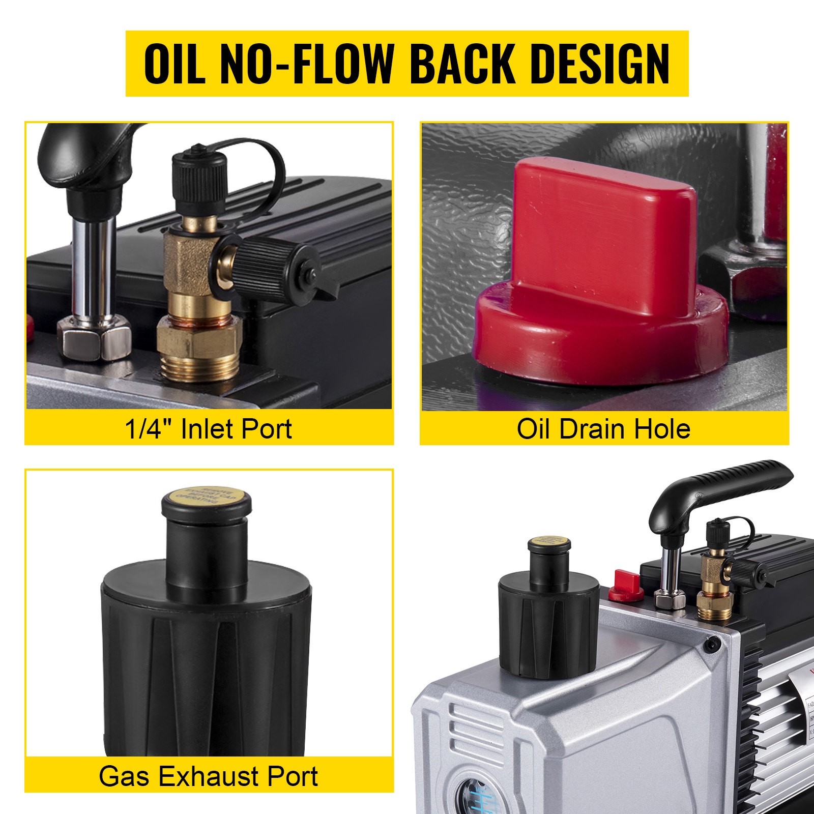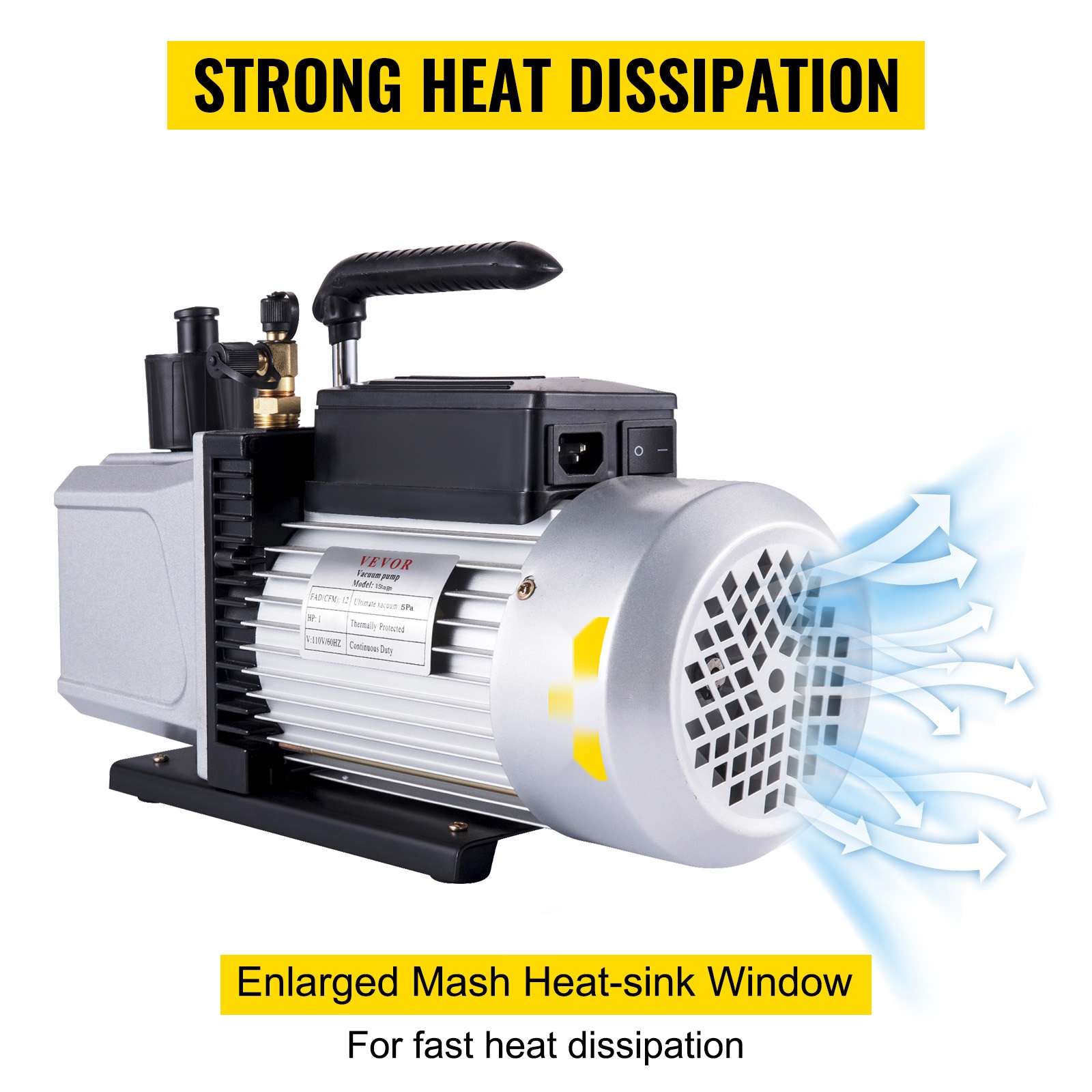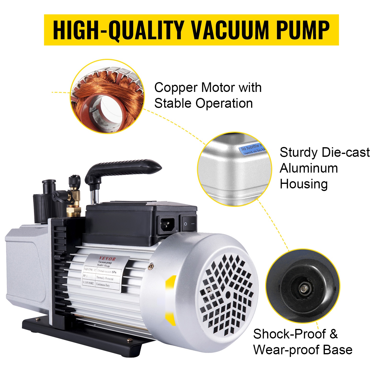 Raskaan käytön alumiiniseosrunko ja kuparikäämimoottori tekevät rakenteesta tukevan ja vakaan. Neljä kumijalkaa lisäävät tyhjiöpumpun vakautta, ja liukuestejalat vähentävät tärinää ja liikkumista käytön aikana.