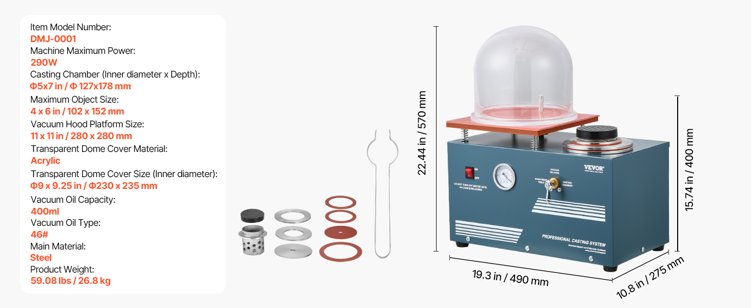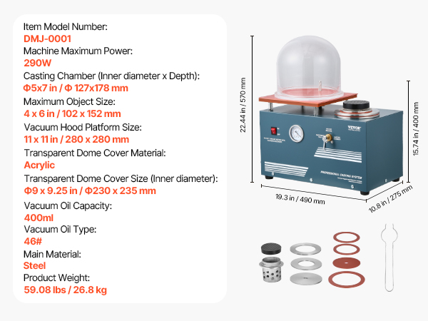 Tyhjiövalukone jalometalleille DMJ-0001, 290W, 3 CFM pumppu, 280 x 280 mm työalusta