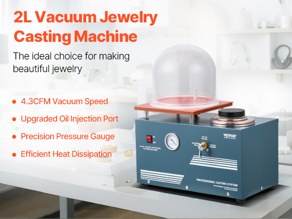Tyhjiövalukone jalometalleille yhdistää suuren kammion, nopean tyhjiönopeuden ja selkeän painemittarin. Laite soveltuu valumuottien valmistukseen esimerkiksi korujen ja pienten metalliosien tuotannossa, kun halutaan vähentää ilmakuplia ja parantaa valun laatua.