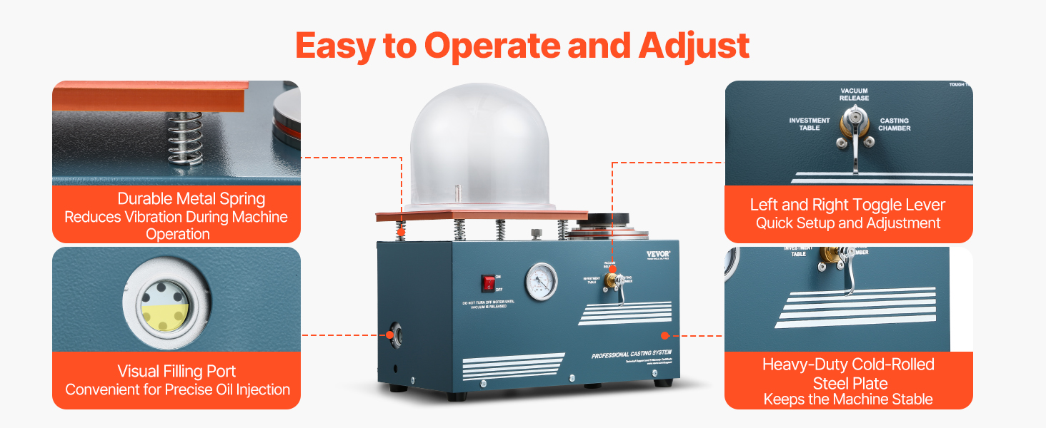 Laitteen suuri tyhjiökammio ja nopea tyhjiöinti tukevat tehokasta ja tarkkaa valuprosessia. Päivitetty öljyntäyttöaukko helpottaa tyhjiööljyn lisäämistä, ja tarkka painemittari auttaa seuraamaan tyhjiön tasoa prosessin aikana.