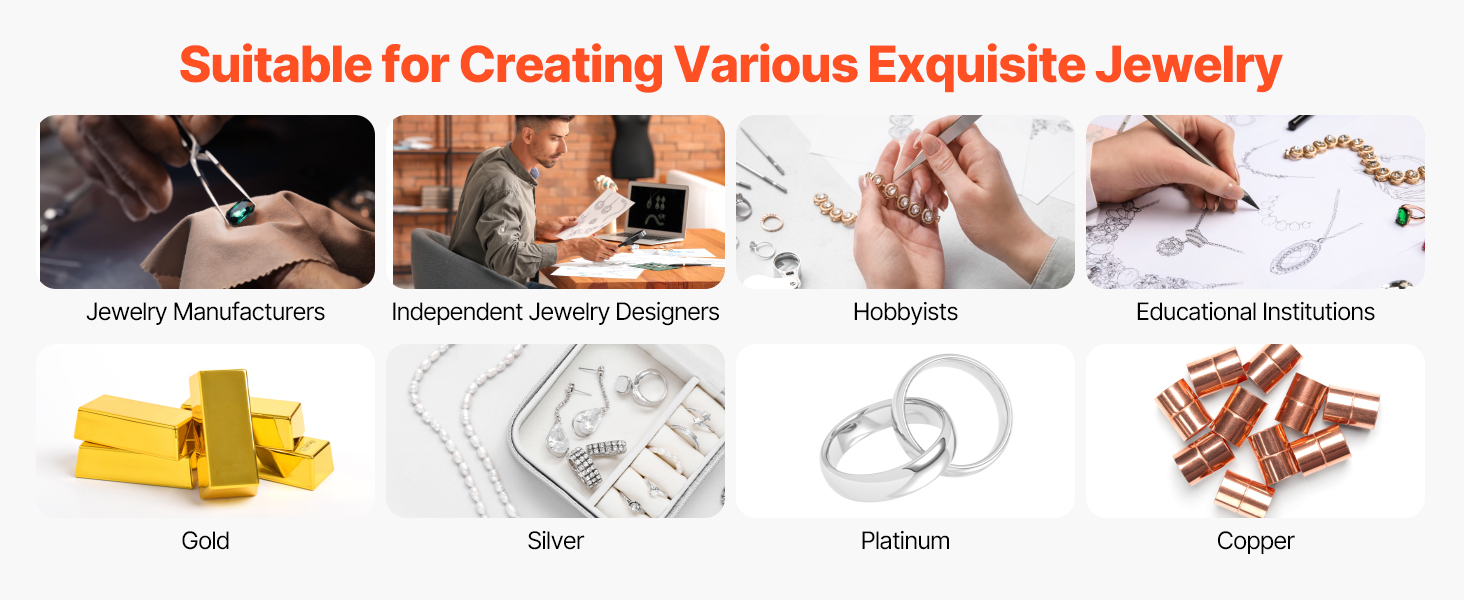 Valukone soveltuu monenlaisiin koruvalusovelluksiin, kuten sormusten, kaulakorujen ja korvakorujen valuihin. Tehokas tyhjiöjärjestelmä auttaa vähentämään ilmakuplia ja valuvikoja, jotta muoteista saadaan tasalaatuisia.