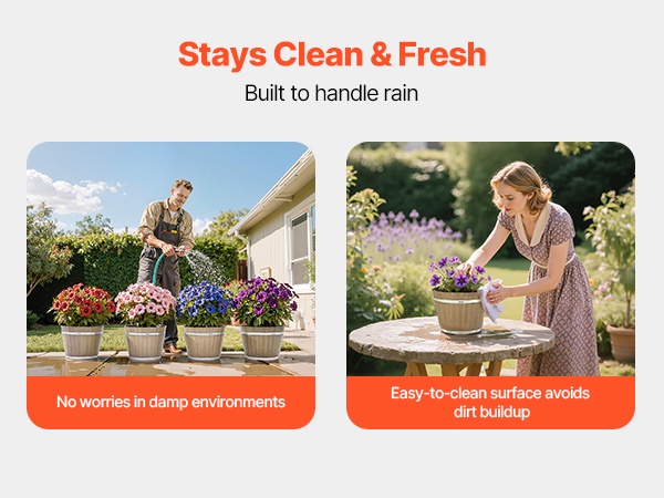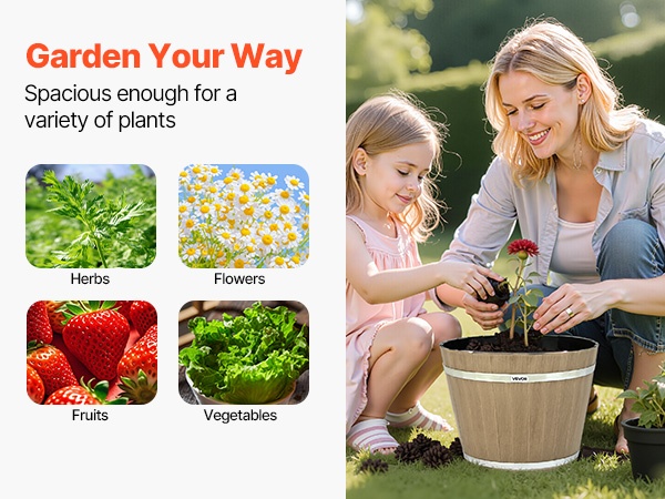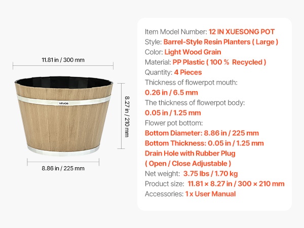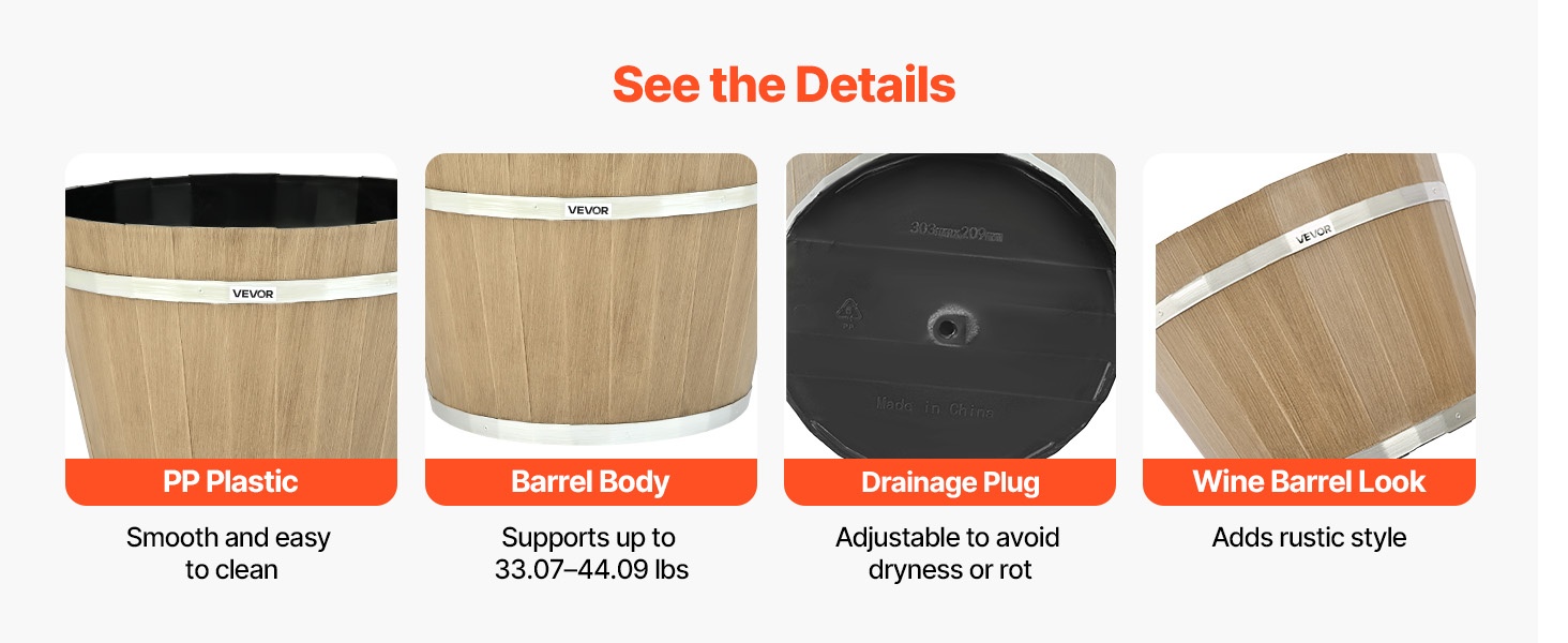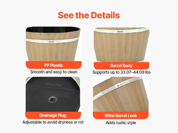 Ruukun pohjassa on säädettävä tyhjennystulppa, jonka ansiosta vedenpoistoa voi mukauttaa sisä- tai ulkokäyttöön ja juurten mätänemisen riski pienenee. Rustiikkinen tynnyrimuoto tuo tyyliä puutarhaan, ja sileä pinta on helppo puhdistaa. Ruukku kestää noin 33–44 lbs painon, joten se on sekä koristeellinen että käytännöllinen.
