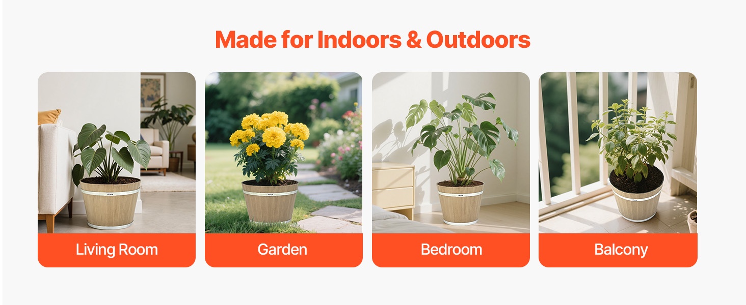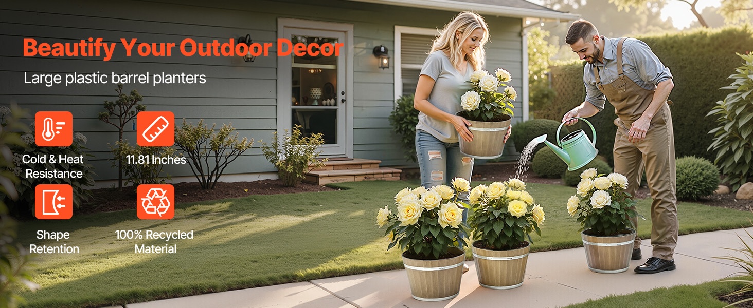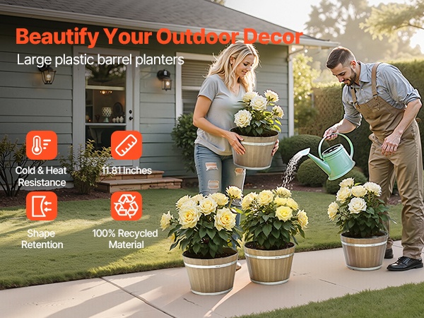 Tämä suuri viskitynnyriä muistuttava kukkaruukku on valmistettu kylmää ja kuumuutta kestävästä PP-muovista, joka ei helposti väänny tai halkeile. 11.81-tuumainen koko sopii hyvin terassien ja parvekkeiden somistamiseen ja auttaa luomaan luonnollisen ja viihtyisän puutarhatunnelman.