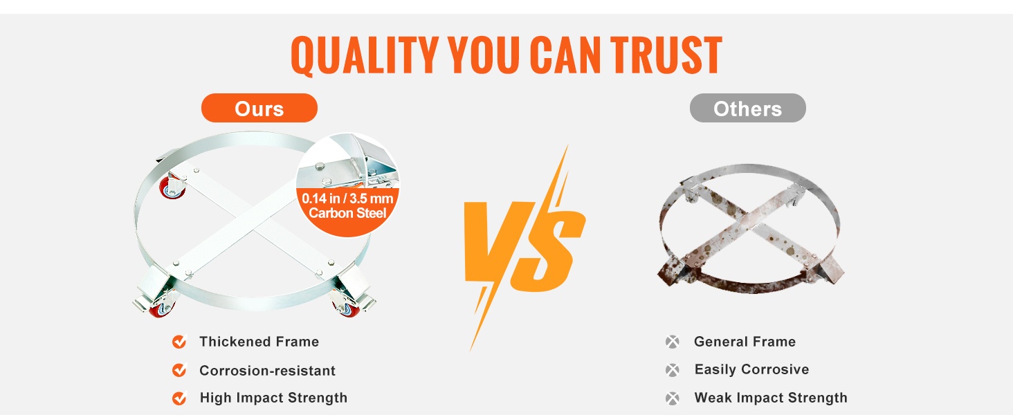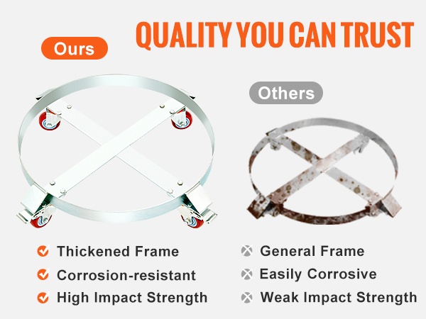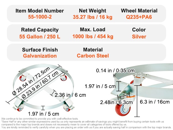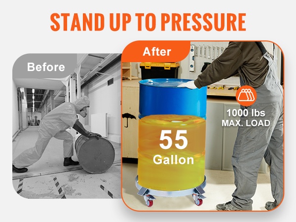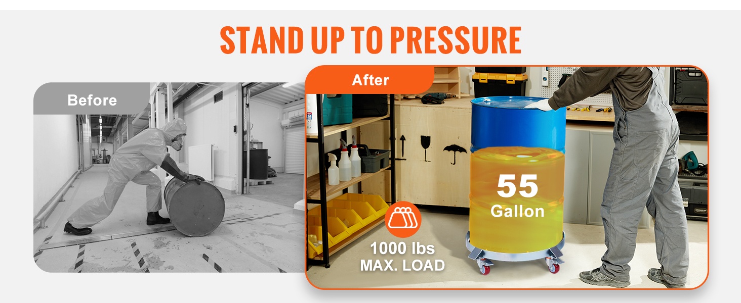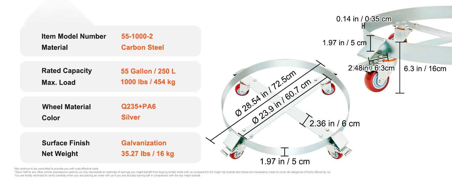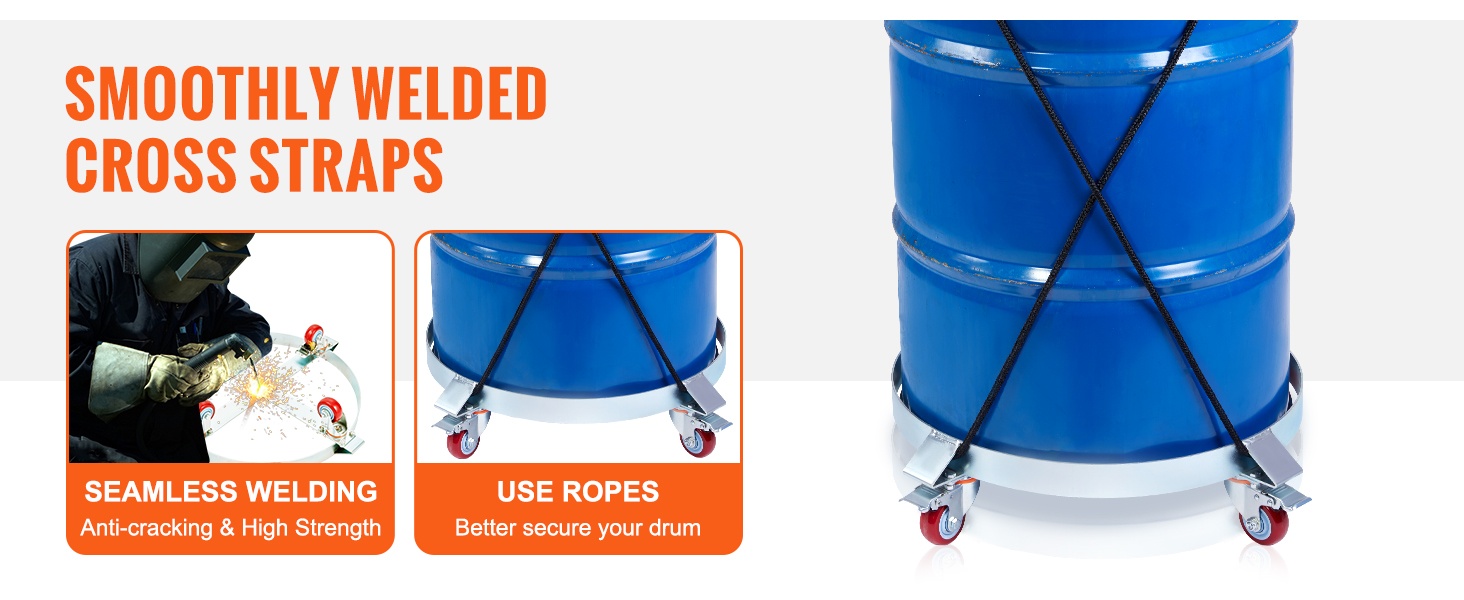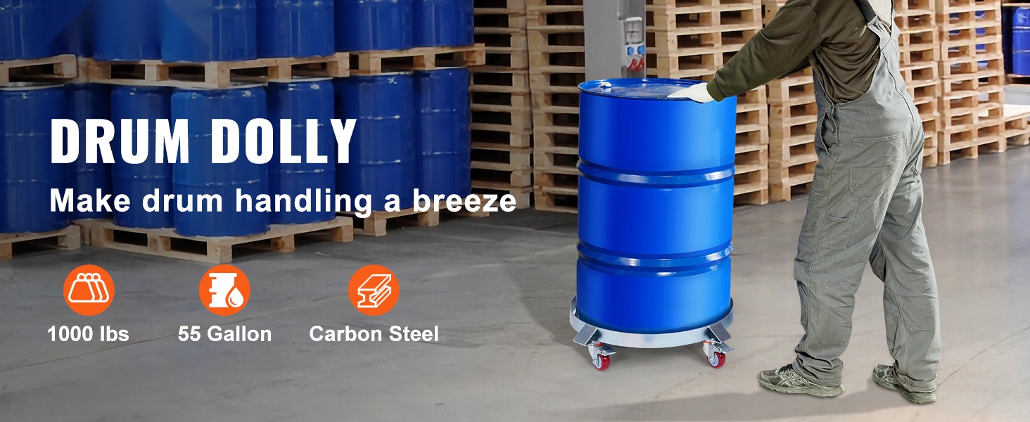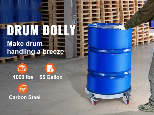 Tämä raskaan käytön tynnyrivaunupari helpottaa ja turvaa 55 gallonan (noin 208.2 L) ja jopa 250L tynnyreiden käsittelyä. Suuren 1,000 lbs / 454 kg kantavuuden ja tukevan teräsrungon ansiosta tynnyrit voidaan siirtää työtilassa vaivattomasti.
