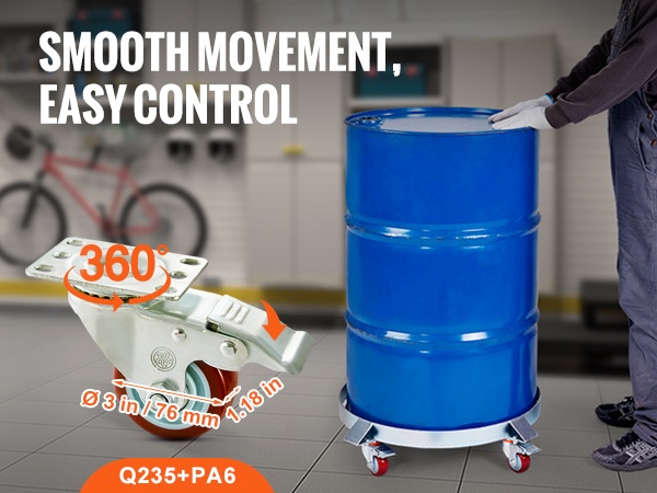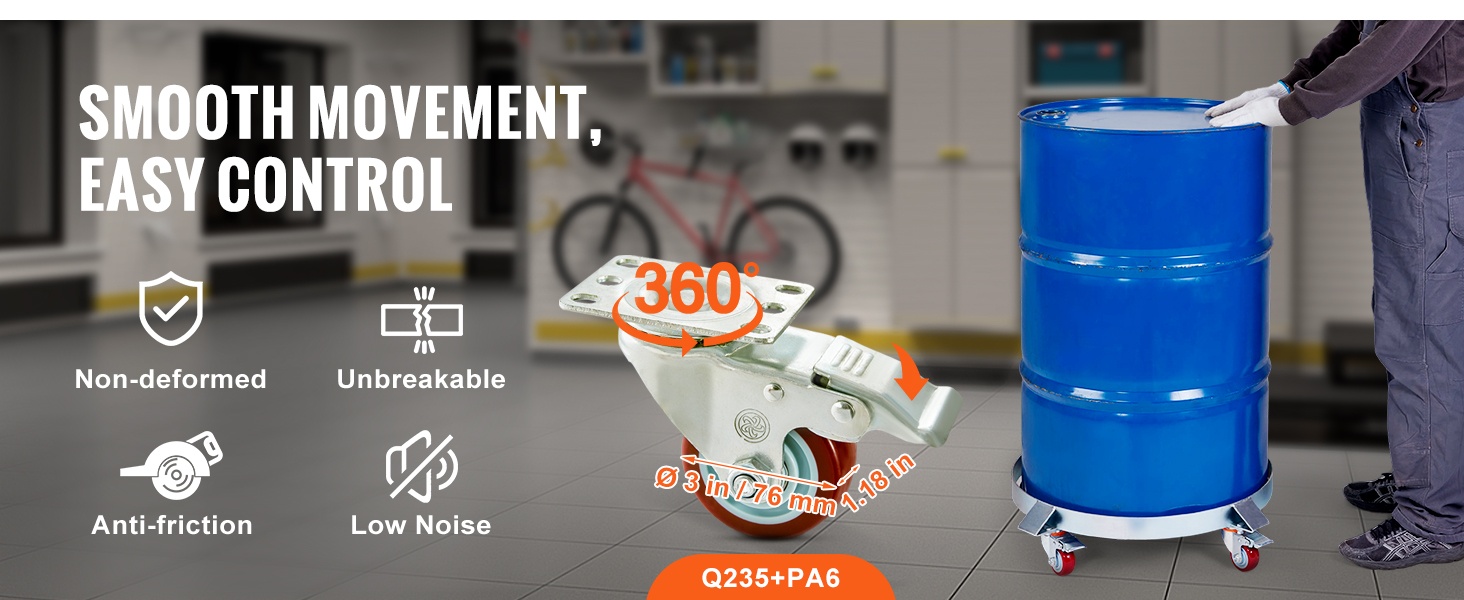 Nelikantaiset kääntyvät pyörät jarruilla helpottavat liikkeen hallintaa. Pyörät on valmistettu materiaalista Q235+PA6, joka kestää kuormitusta ja säilyttää muotonsa käytössä.