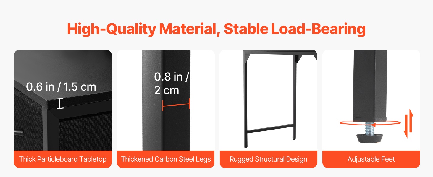 Paksu lastulevystä valmistettu pöytälevy ja ruosteenkestävä hiiliteräsrunko kestävät päivittäistä käyttöä. Vahvistettu jalusta ja säädettävät jalkatassut parantavat vakautta ja vähentävät heilumista epätasaisillakin lattioilla.