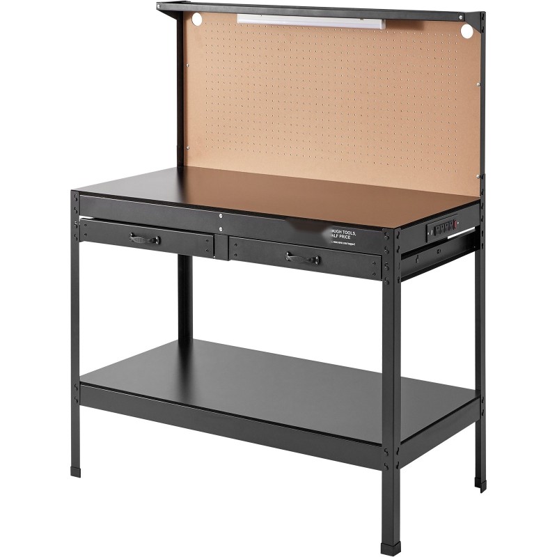 Työpöytä sopii autotalliin, verstaaseen ja harrastetilaan, kun tarvitaan tukeva alusta ja kätevää sähkönsyöttöä työkaluille. Runkona on kestävä A3-teräs, ja kaksitasoinen työtaso tukee jopa 220 paunaa / 100 kg. Yläosan reiällinen taustalevy helpottaa työkalujen järjestämistä, ja mukana tulevat koukut, vetolaatikot sekä integroidut pistorasiat ja USB-portit pitävät usein käytetyt välineet ja laitteet helposti saatavilla.Työpöydässä on 14W LED-valaistus, joka parantaa näkyvyyttä yksityiskohtaisissa töissä. Kumijalat lisäävät vakautta ja suojaavat lattiaa, ja 1.5 m virtajohto tekee sijoittelusta joustavampaa.