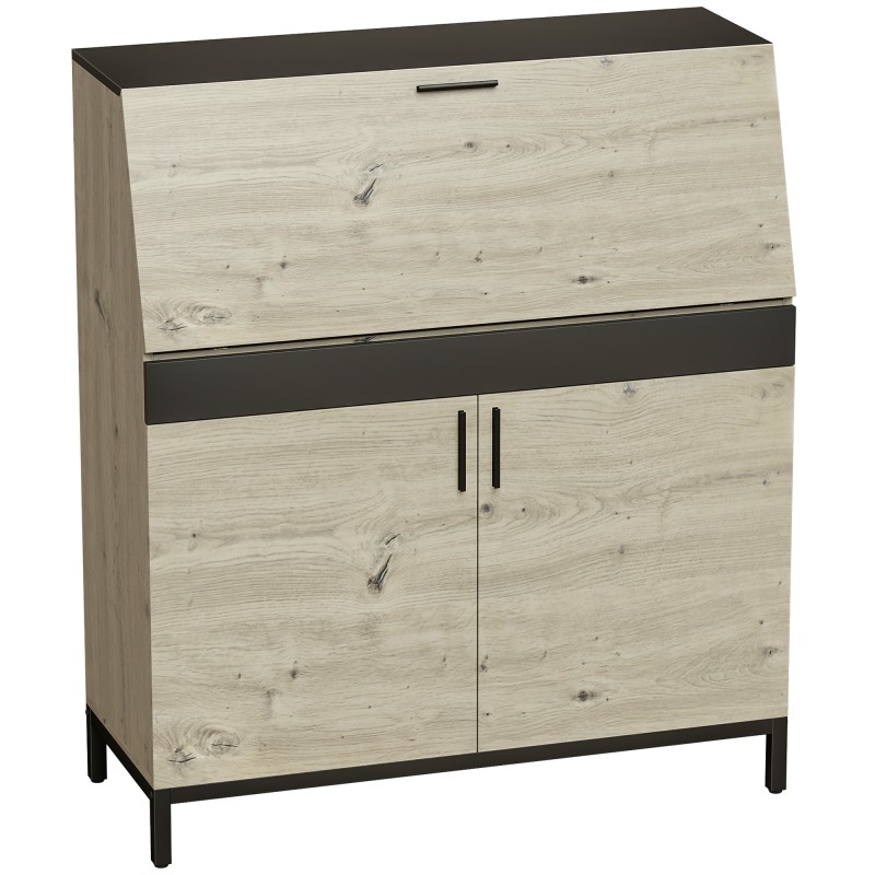 Tämä kompakti työpöytä tekee pienestäkin huoneesta toimivan työskentelytilan. Alas laskettava etuosa avaa 100 cm leveän työskentelytason, ja kun työ on valmis, osa kääntyy takaisin ylös ja kaluste muuttuu siistiksi kaapiksi. Pystysuuntainen säilytysratkaisu, lämmin puunsävy ja musta metallirunko tuovat kotiin selkeyttä ja rauhallisen ilmeen.