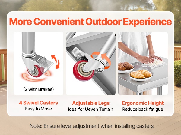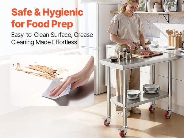 Työtason, hyllyjen ja jalkojen materiaalina on SUS201-ruostumaton teräs, joka tarjoaa hyvän korroosionkestävyyden ja siistin ulkonäön. Materiaali kestää hyvin käyttöä, vettä ja roiskeita, ja puhdistus onnistuu ilman erikoisaineita.