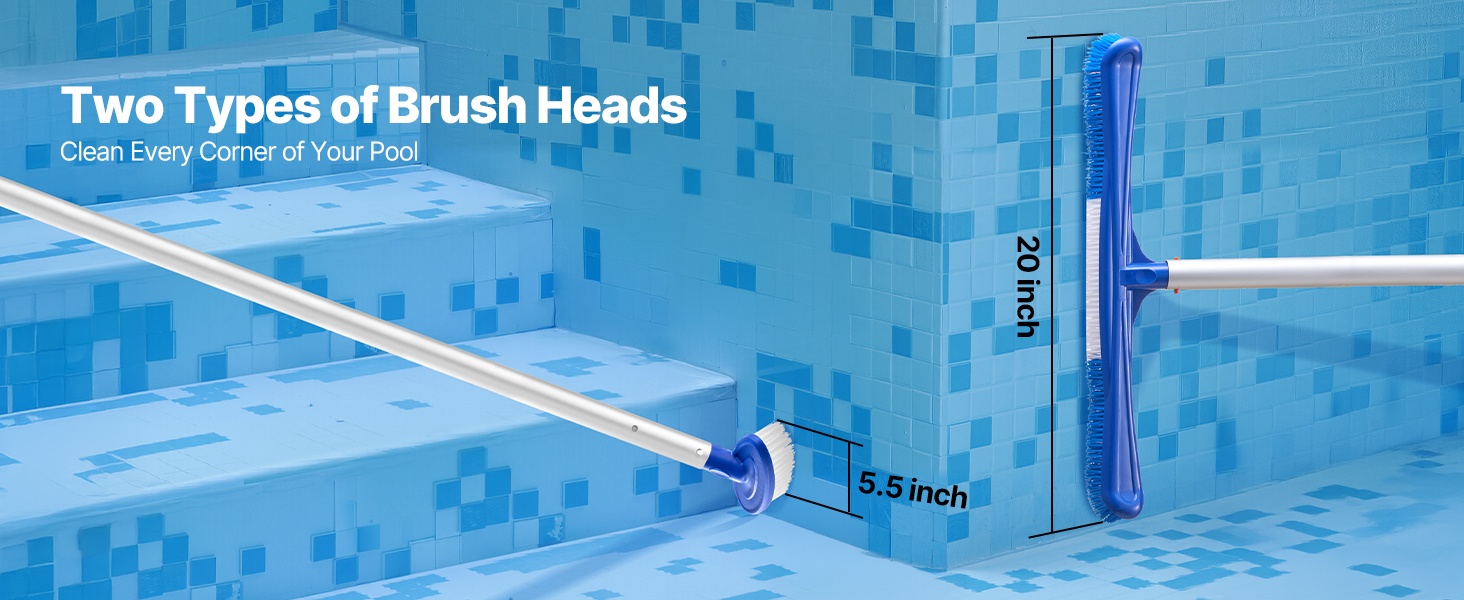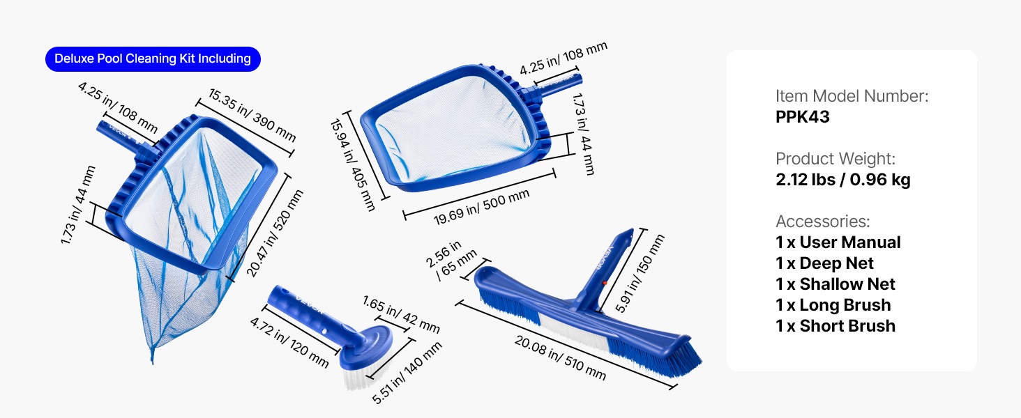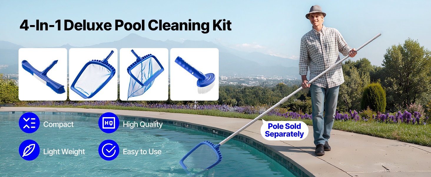 Tämä käytännöllinen uima-altaan puhdistussetti sisältää 2 irrotettavaa harjapäätä ja 2 haavia. Syvä haavi kerää roskat altaan pohjasta, matala haavi poistaa kelluvat lehdet ja muun lian veden pinnalta. Pitkä ja lyhyt harja auttavat puhdistamaan pinttyneet tahrat ja altaan nurkat vaivattomasti. Setti toimitetaan ilman varsia.