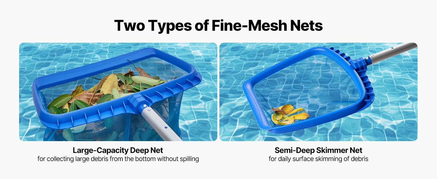 Syvä haavi, jossa on suuri kapasiteetti, helpottaa isompien roskien, kuten lehtien ja oksien, keräämistä altaan pohjasta. Matala haavi sopii päivittäiseen ylläpitopuhdistukseen ja veden pinnalla kelluvien roskien poistamiseen, jotta vesi pysyy kirkkaana ja puhtaampana.