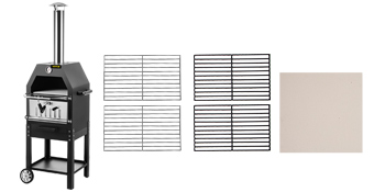 Pakkaukseen kuuluu ulkopizzauuni, pizzakivi, 12‑tuumainen pizzalapio, kaksi ruostumattomasta teräksestä valmistettua grilliritilää, kaksi rautahiiliritilää, piipunhattu, piippu, eristelevy, hiilialusta, jalkaosat, pohjalevy, pyörien yhdystanko, kahvat, kiinnityslevyt, renkaat, ruuvit, mutterit, ristikkoavain ja kiintoavain.