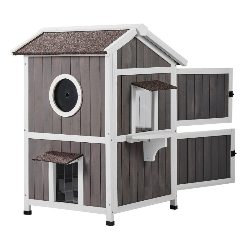 Tämä kaksikerroksinen ulkokissatalo tarjoaa suojaisan ja mukavan paikan sekä koti- että villikissoille. Säänkestävät materiaalit, suojaavat oviverhot ja selkeä ikkuna tekevät siitä turvallisen lepopaikan ympäri vuoden.