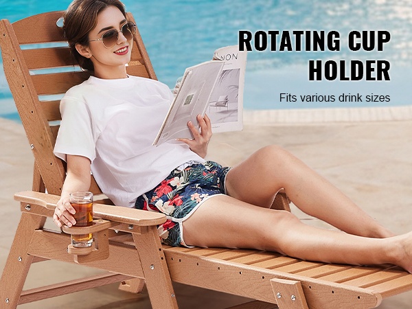 Leveät käsinojat tukevat mukavasti käsivarsia, ja suuri kääntyvä mukiteline pitää juoman käden ulottuvilla. Näiden yksityiskohtien ansiosta piha, terassi tai allasalue tuntuu entistä viihtyisämmältä.