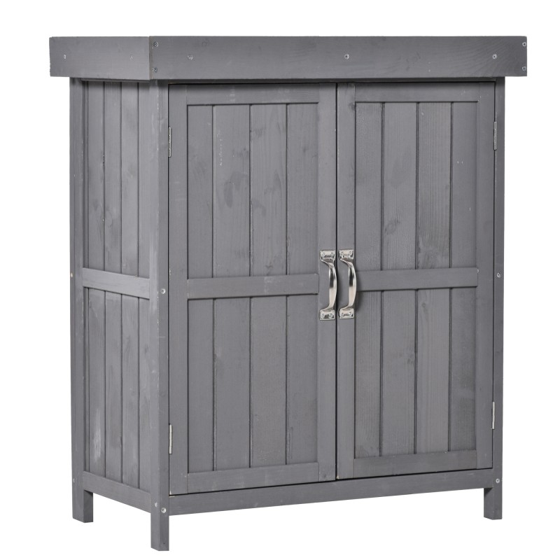 Ulkosäilytyskaappi puutarhaan, kuusi, 2 hyllyä, kaksiosainen ovi ja klappikansi, 74 x 43 x 88 cm, harmaa