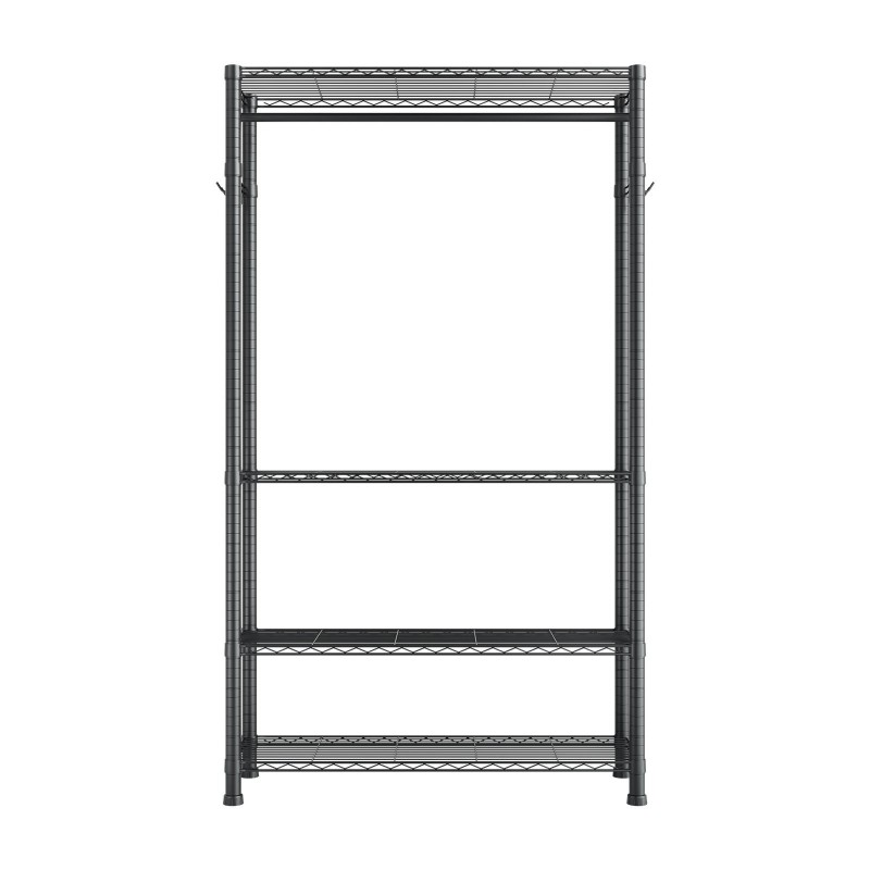 Tämä vankasta hiiliteräksestä valmistettu vaateteline tarjoaa runsaasti säilytystilaa vaatteille ja asusteille. Neljä korkeussäädettävää hyllytasoa ja vaatetanko helpottavat erikokoisten vaatteiden järjestämistä, joten teline sopii hyvin makuuhuoneeseen, vaatehuoneeseen, eteiseen tai myymälään.
