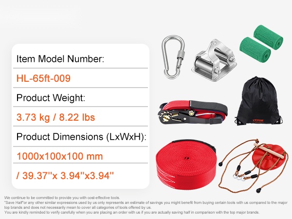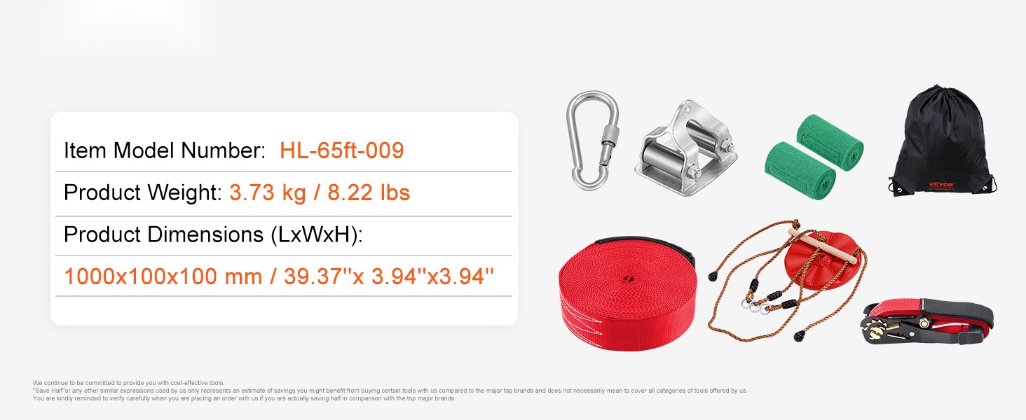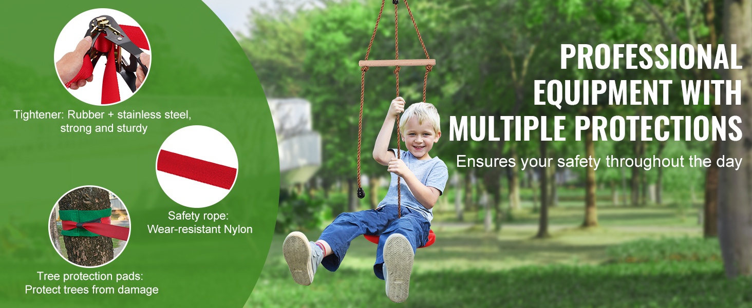 Turvallisuutta lisäävät sekä istuimen turvavyöt että köyden turvavaljaat, jotka auttavat vähentämään loukkaantumisriskiä. Mukana on kaksi puunsuojaa, jotka ehkäisevät puiden vaurioitumista ja toimivat samalla liinansuojina. Kiristin helpottaa liinojen kiristämistä ja lukitsemista yksinkertaisella toiminnolla.