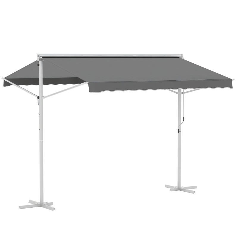 Tämä vapaasti seisova harmaa terassimarkiisi luo miellyttävän varjoisan oleskelupaikan puutarhaan, pihalle tai terassille. Markiisi on helppo avata ja sulkea käsikammen avulla, ja katon kallistuskulmaa säätämällä saat suojan auringolta eri vuorokaudenaikoina. Tukeva runko ja suuri jalusta pitävät kokonaisuuden vakaana, joten voit nauttia kesäpäivistäsi rennosti viileässä varjossa.