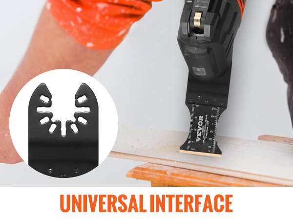 Yleisliitäntä on suunniteltu nopeaan terän vaihtoon. Pikalukitus mahdollistaa terien irrotuksen ja kiinnityksen muutamassa yksinkertaisessa vaiheessa ilman monimutkaisia työkaluja.