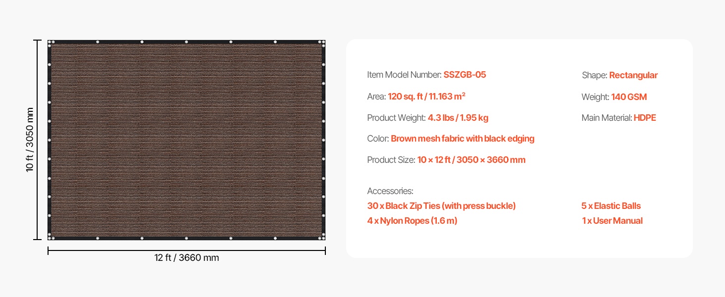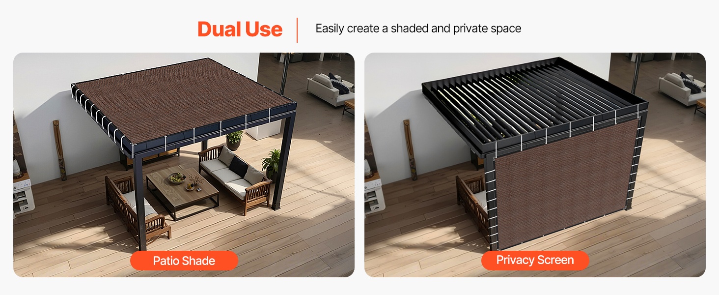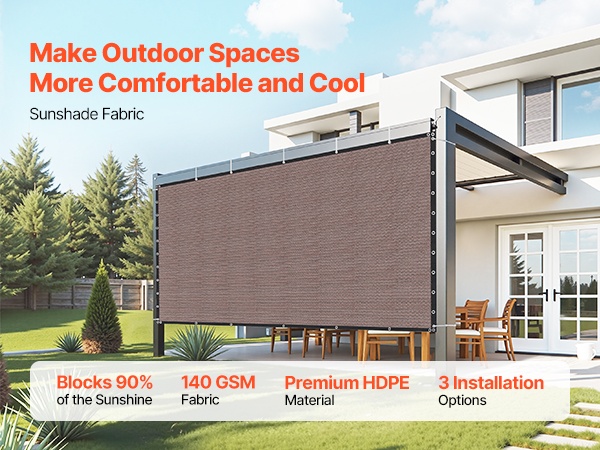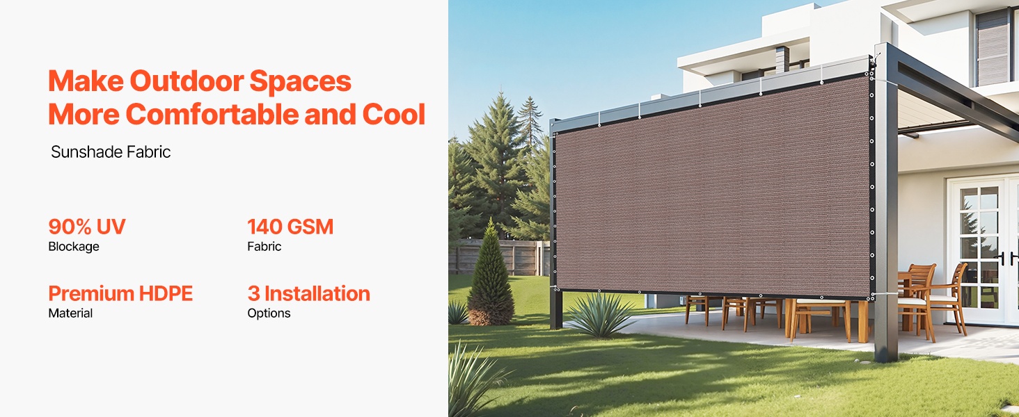 Kestävä 90 % varjokangas tarjoaa miellyttävän varjon ja lisää yksityisyyttä terassille, puutarhaan ja muille ulkoalueille. 140 GSM HDPE-kangas on repäisyä ja kulutusta kestävä, hengittävä ja vettä hylkivä, joten se sopii pitkäaikaiseen ulkokäyttöön.